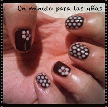 Se trata de una manicura en marrón chocolate y puntos en rosa clarito. En el pulgar y el anular he hecho una flor sencilla con una piedrecita rosa en el centro.